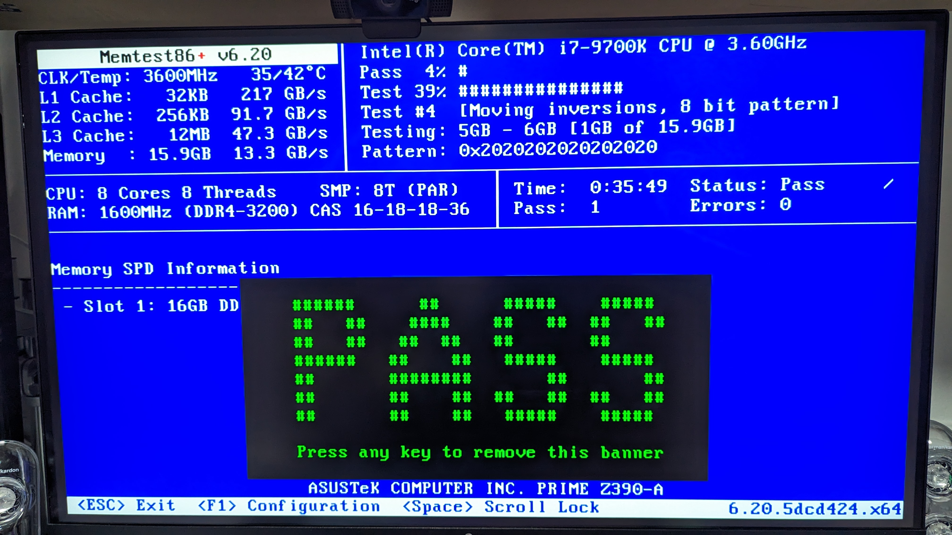 Huh. So I’ve got what seems to be a perfectly fine computer, that does 99% of everything I’ve asked of it without fail. But that 1% was really bugging me. So I decided to step outside the OS and boot EndeavourOS from a USB stick. Since one of the options when you boot is the low-level memtest86+ I figured, ‘why not?’.